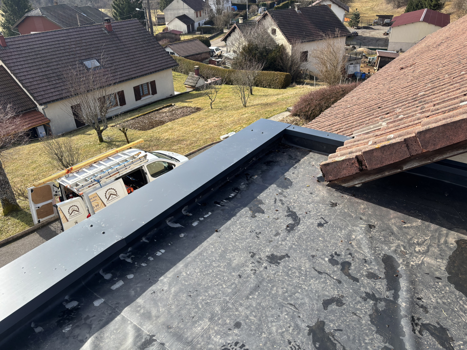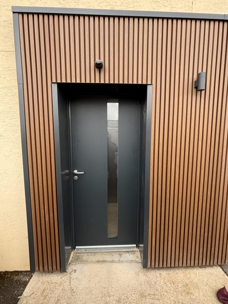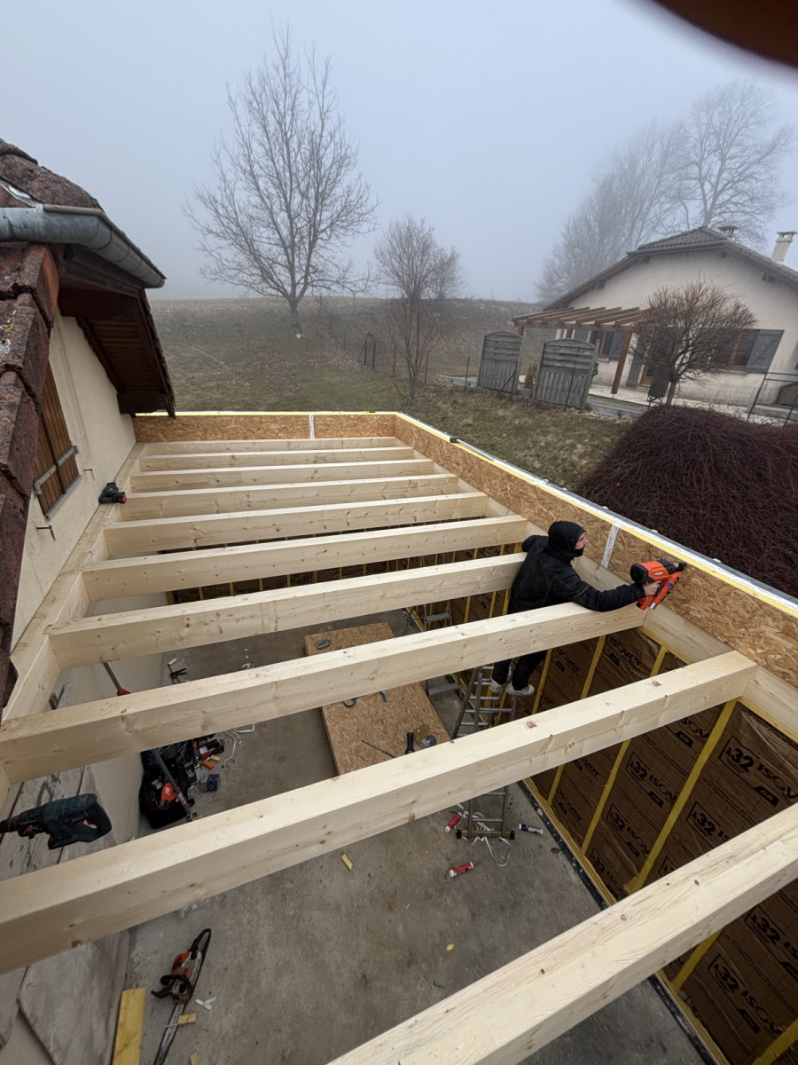 Extension d’habitation en ossature bois, au design cubique et toit plat, associant isolation performante et finitions modernes. Cette construction contemporaine s’intègre parfaitement à une maison traditionnelle, créant un ensemble harmonieux, élégant et économe en énergie.