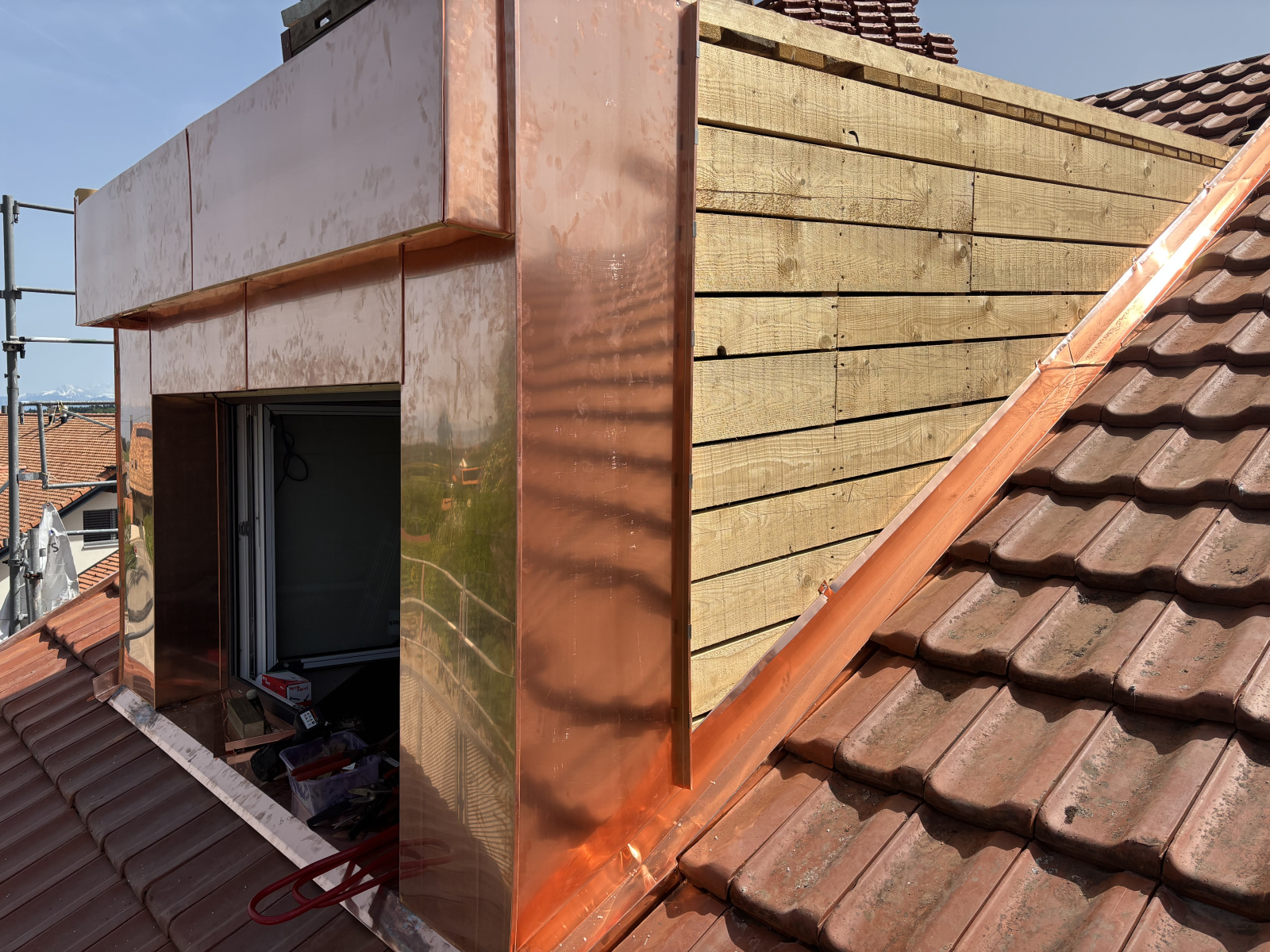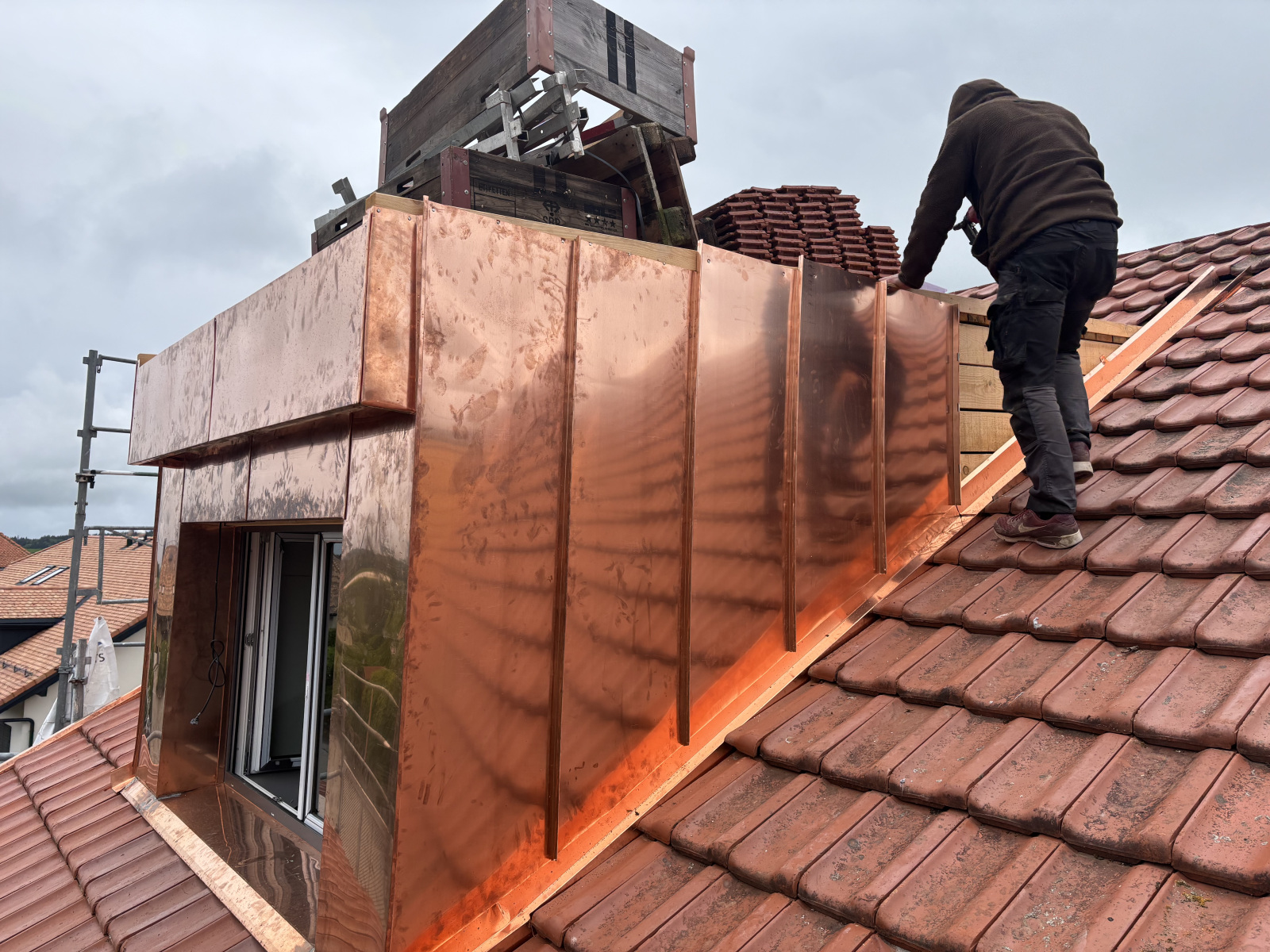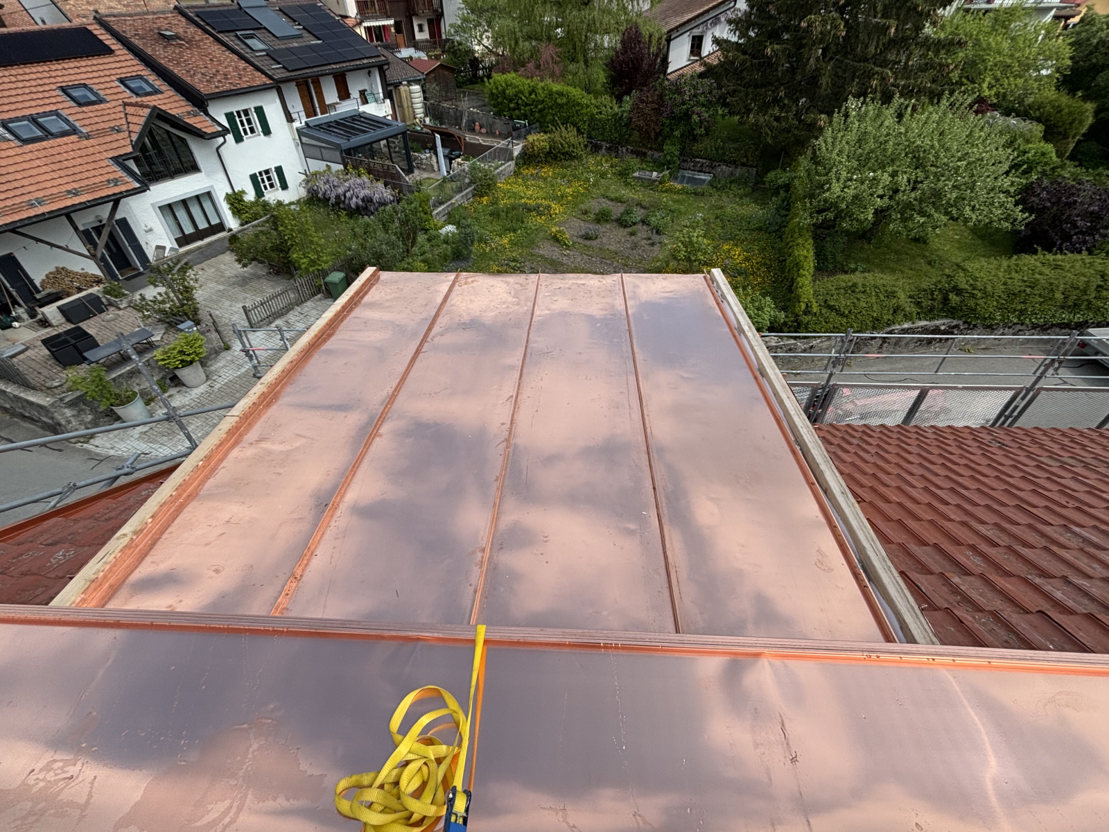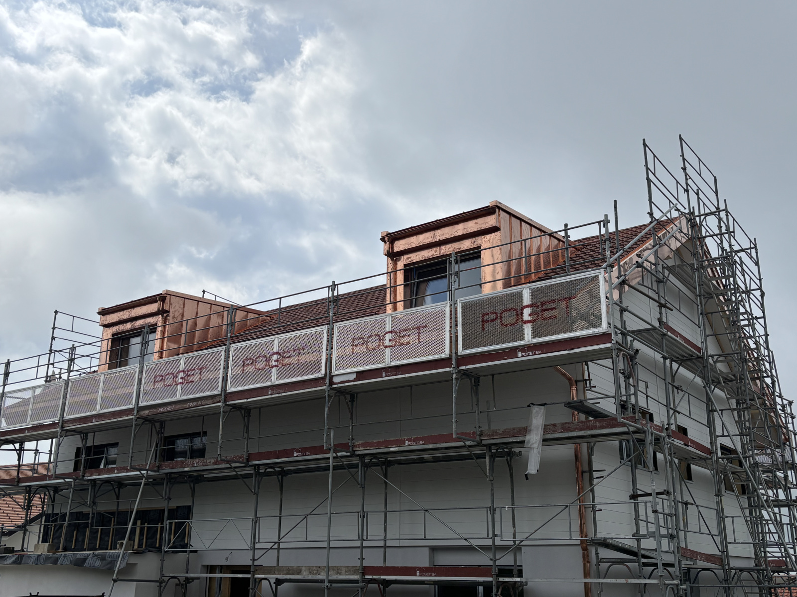 Rénovation complète et isolation extérieure d’un bâtiment, avec toiture tuiles et finitions cuivre. Les murs ont été isolés par l’extérieur et habillés d’un bardage CanExel pour un rendu moderne, durable et une excellente performance énergétique. Un projet alliant esthétique, confort et qualité des matériaux.